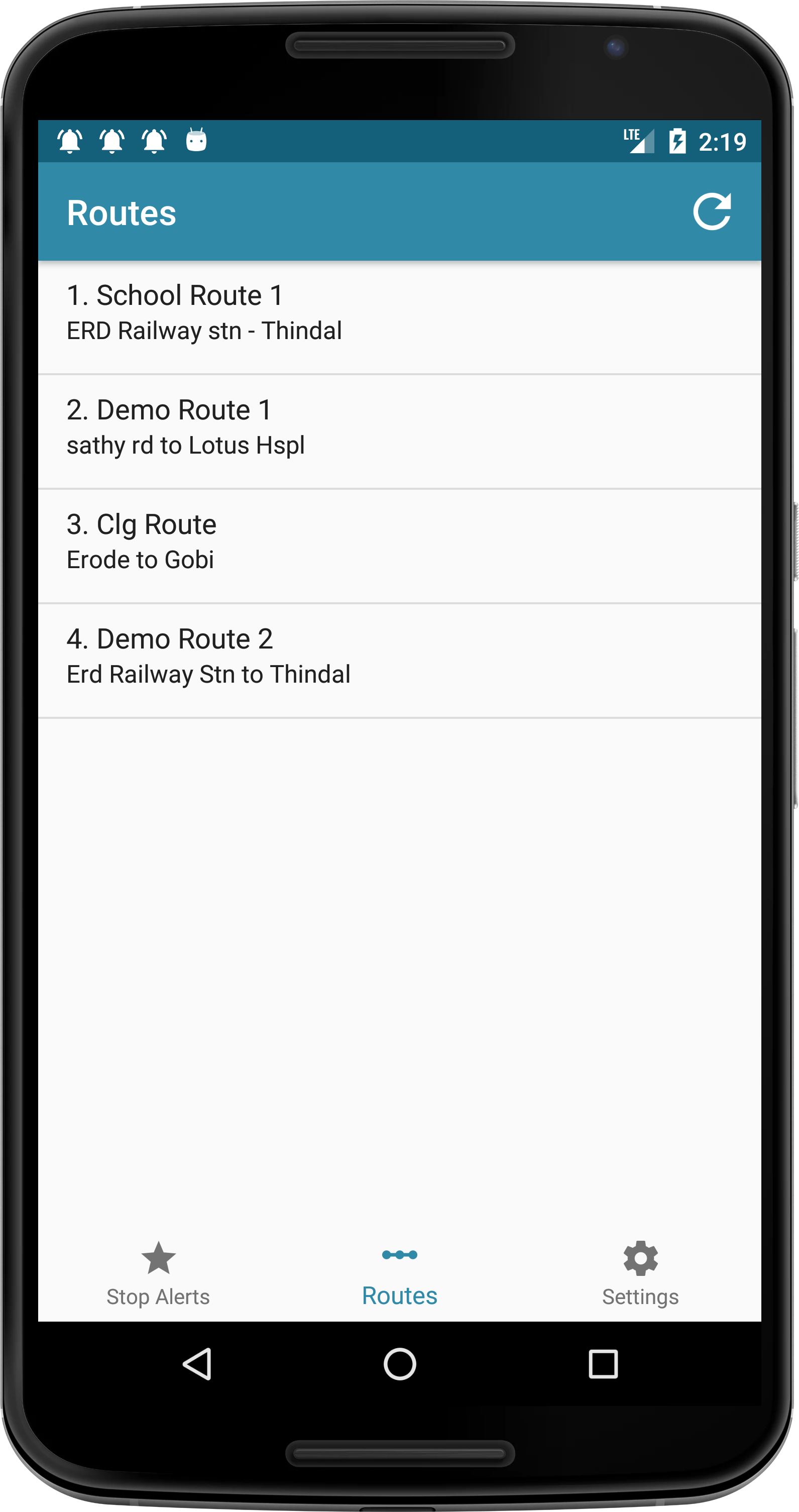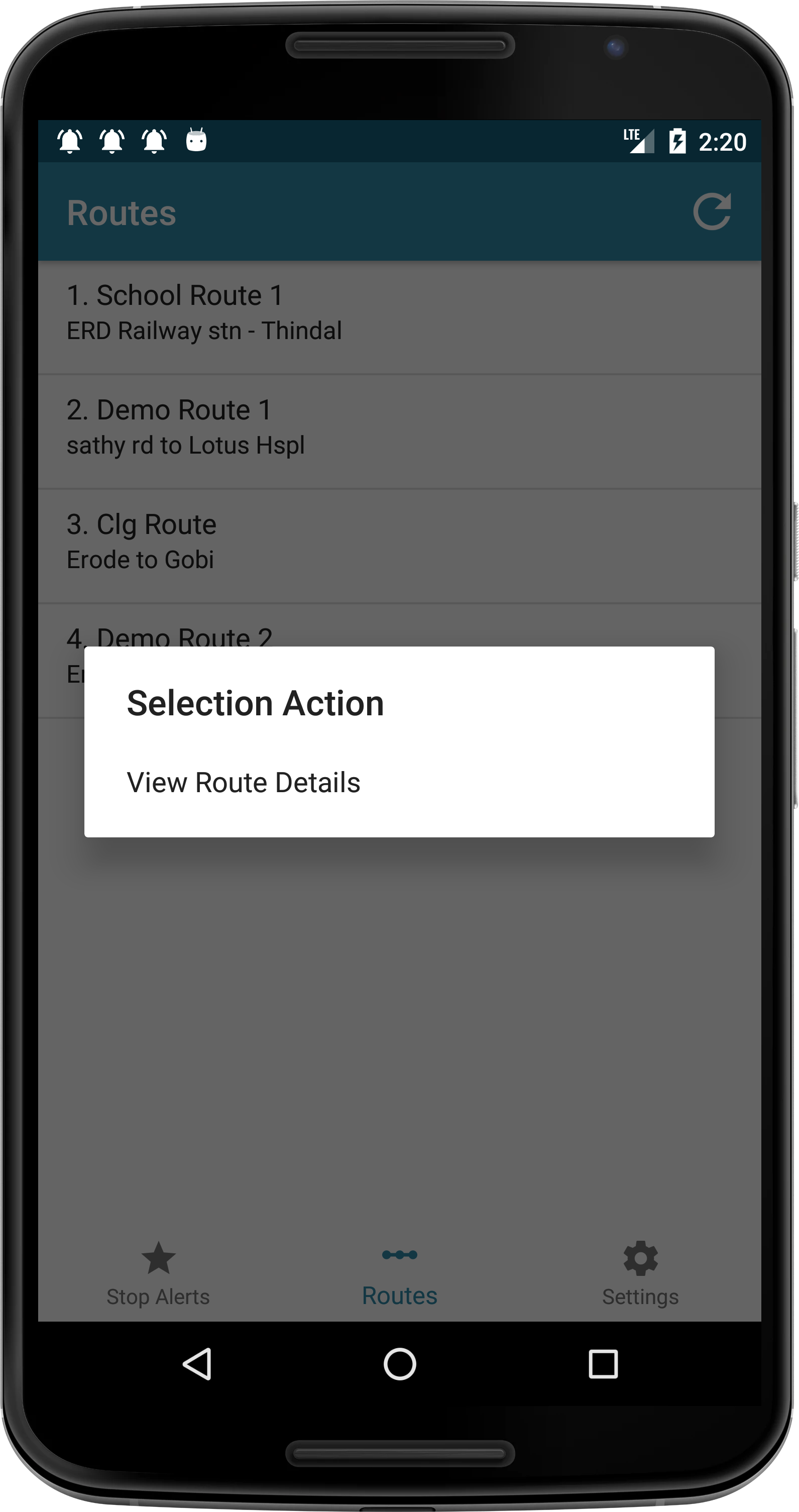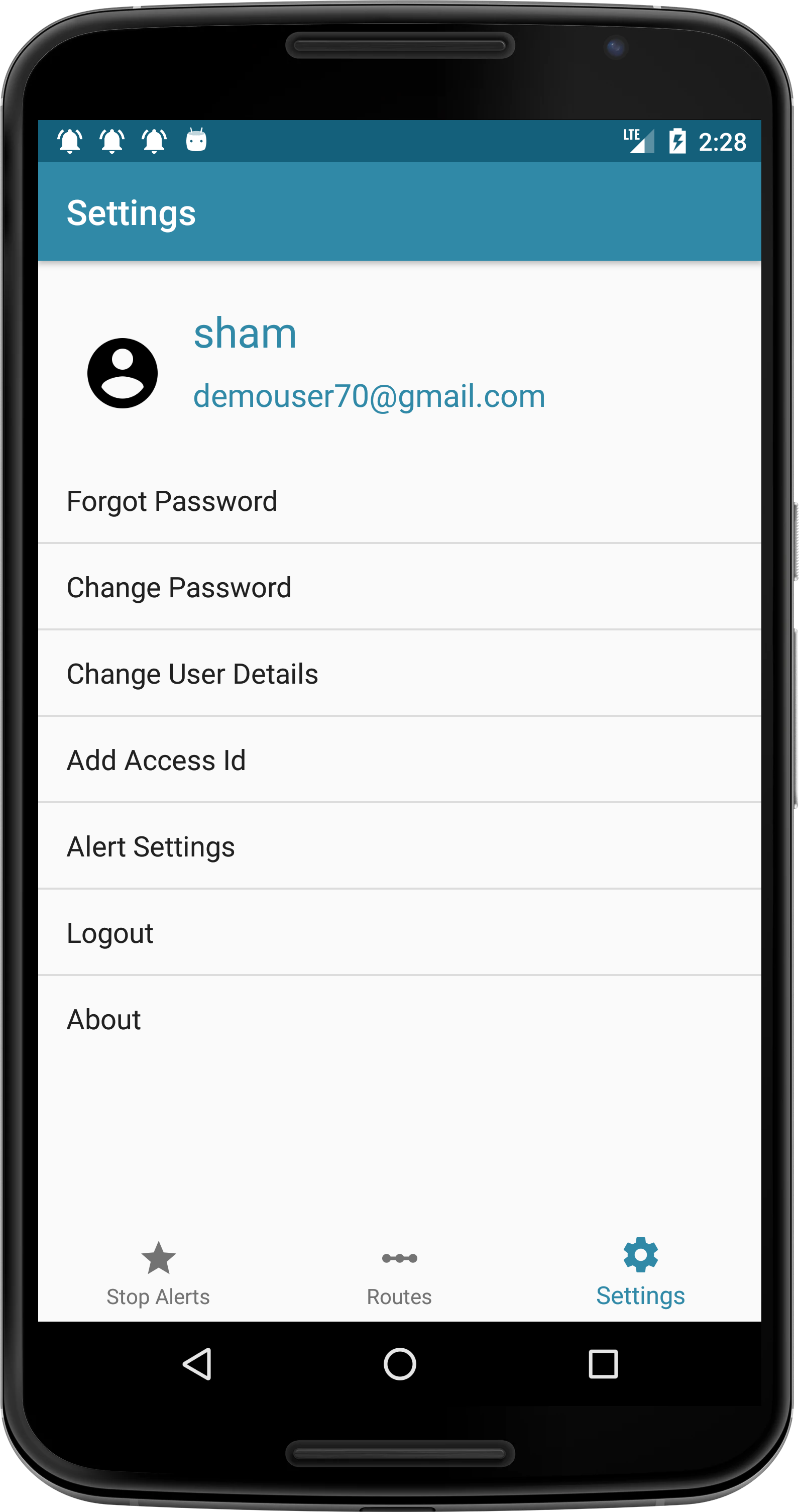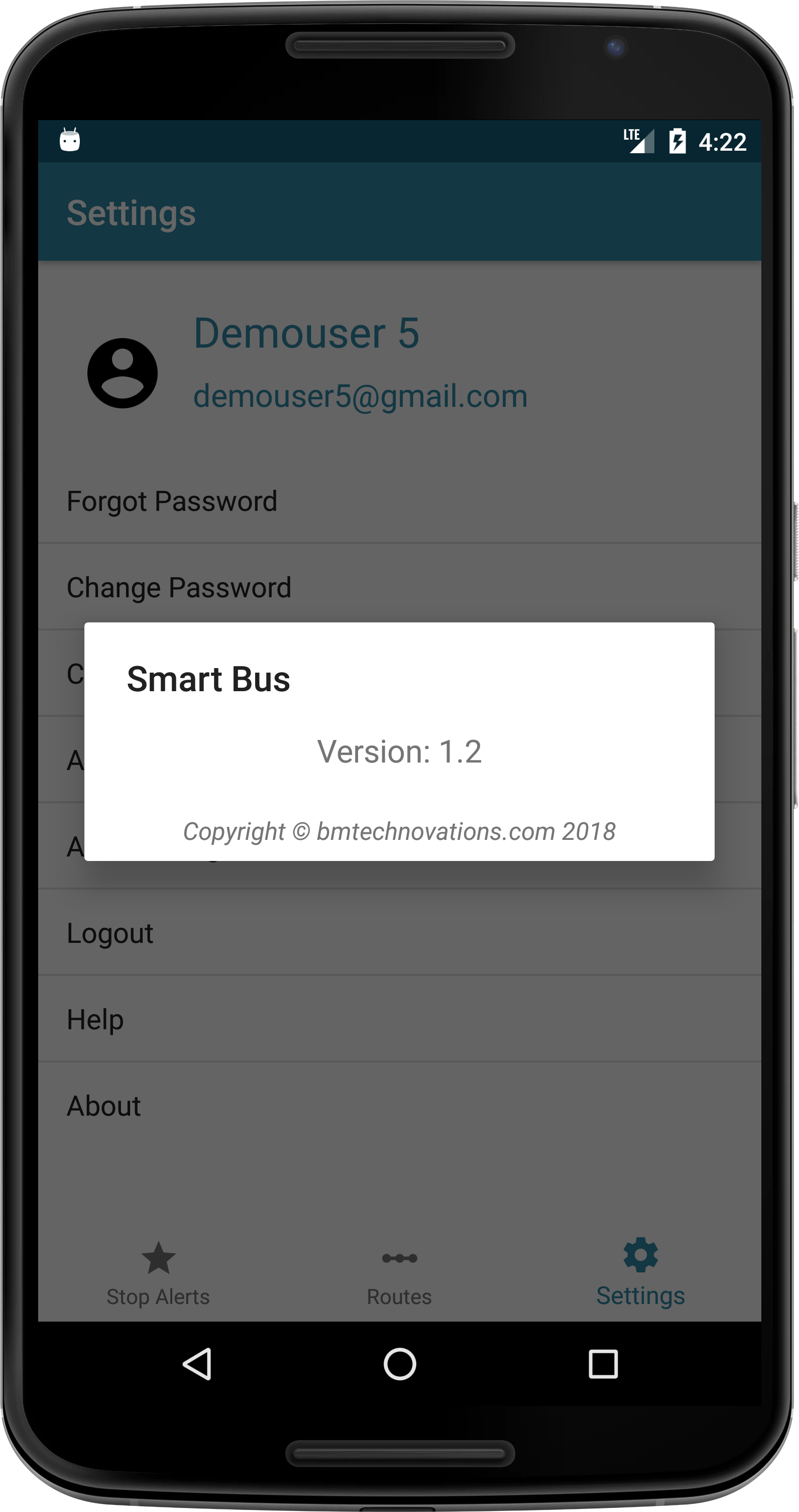 Enable or disable stop alert notification. change alert ringtone.View about